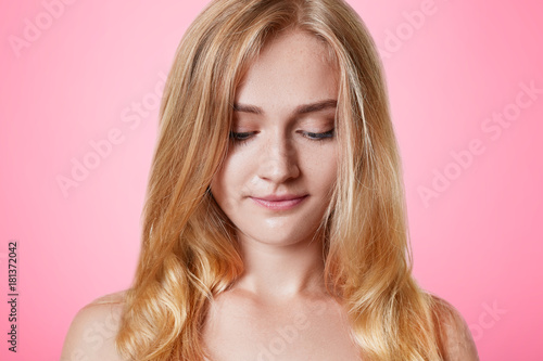 Serious Blonde Female With Appealing Apearance Looks Down Has Shy