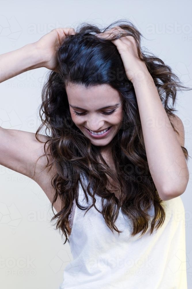 Portrait Of Beautiful Curly Dark Hair Girl Looking Down Stock