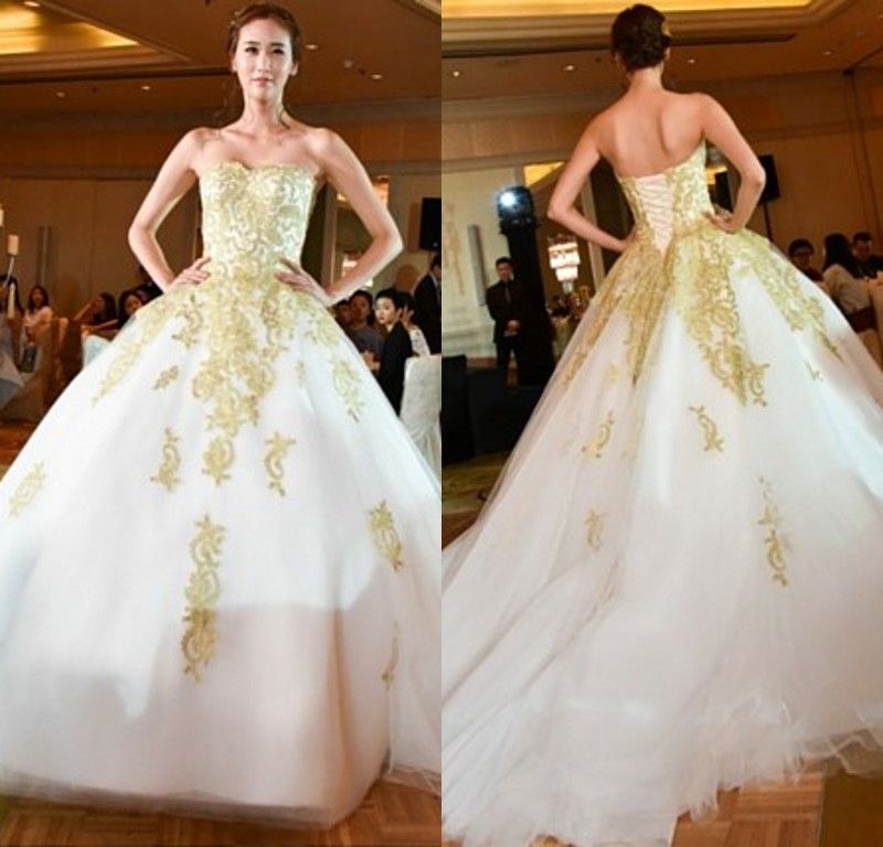 Strapless Embroidery Ball Gown White With Gold Wedding