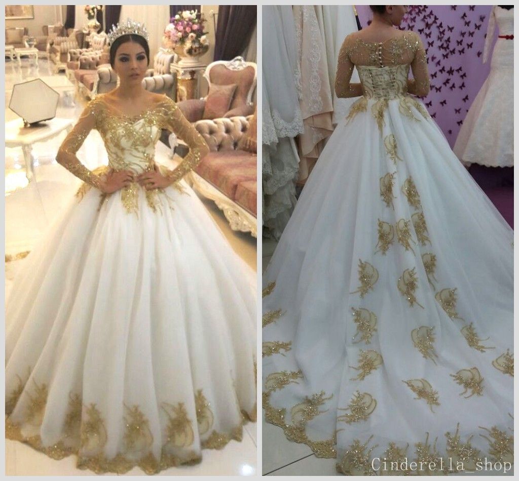 2018 White Ball Gown Wedding Dresses With Gold Sequined Appliques Lace Sheer Jewel Neck Long Sleeve Illusion Bodice Sweep Train Bridal Gowns Wedding